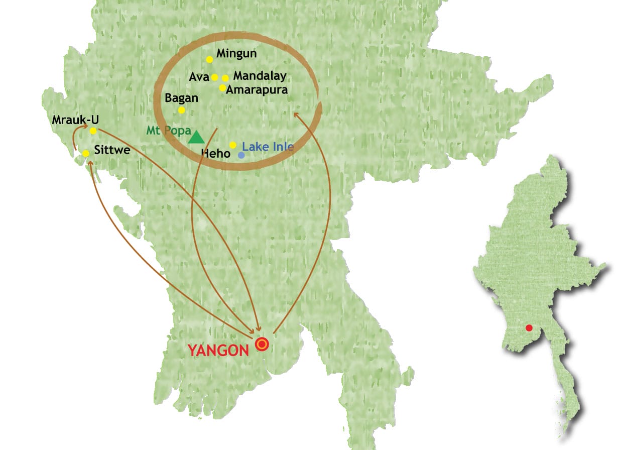 Yangon - Bagan - Amarapura - Ava (Inwa) - Pindaya - Inle Lake - Sittwe - Mrauk U - Chin Village - Heho - Mount Popa
