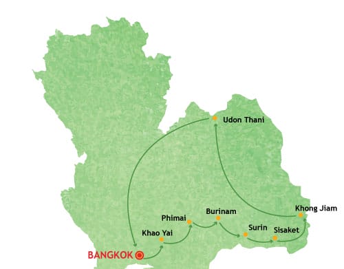 Day 1: Bangkok arrival (-/-/-) Day 2: Bangkok – Khao Yai (B/-/-) Day 3: Khao Yai – Phimai – Korat (B/-/-) Day 4: Korat – Buriram – Surin (B/-/-) Day 5: Surin – Sisaket – Khong Jiam (B/-/-) Day 6: Khong Jiam – Mukdaham – Nakhon Phanom (B/-/-) Day 7: Nakhon Phanom – Sakhon Nakhon – Udon Thani (B/-/-) Day 8: Udon Thani – Nong Khai – Bangkok – Departure (B/-/-) |