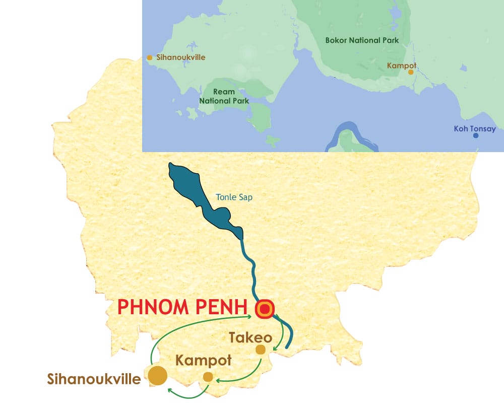 | Day 01: Phnompenh – Takeo – Kampot (L) Day 02: Kampot – Bokor National Park – Kampot (B.L) Day 03: Kampot – Koh Tonsay (B.L) Day 04: Rabbit Island – Ream National Park – Sihanoukville (B.L) Day 05: Sihanoukville (B) Day 06: Sihanoukville (B) Day 07: Sihanoukville – Phnompenh – Departure (B) |