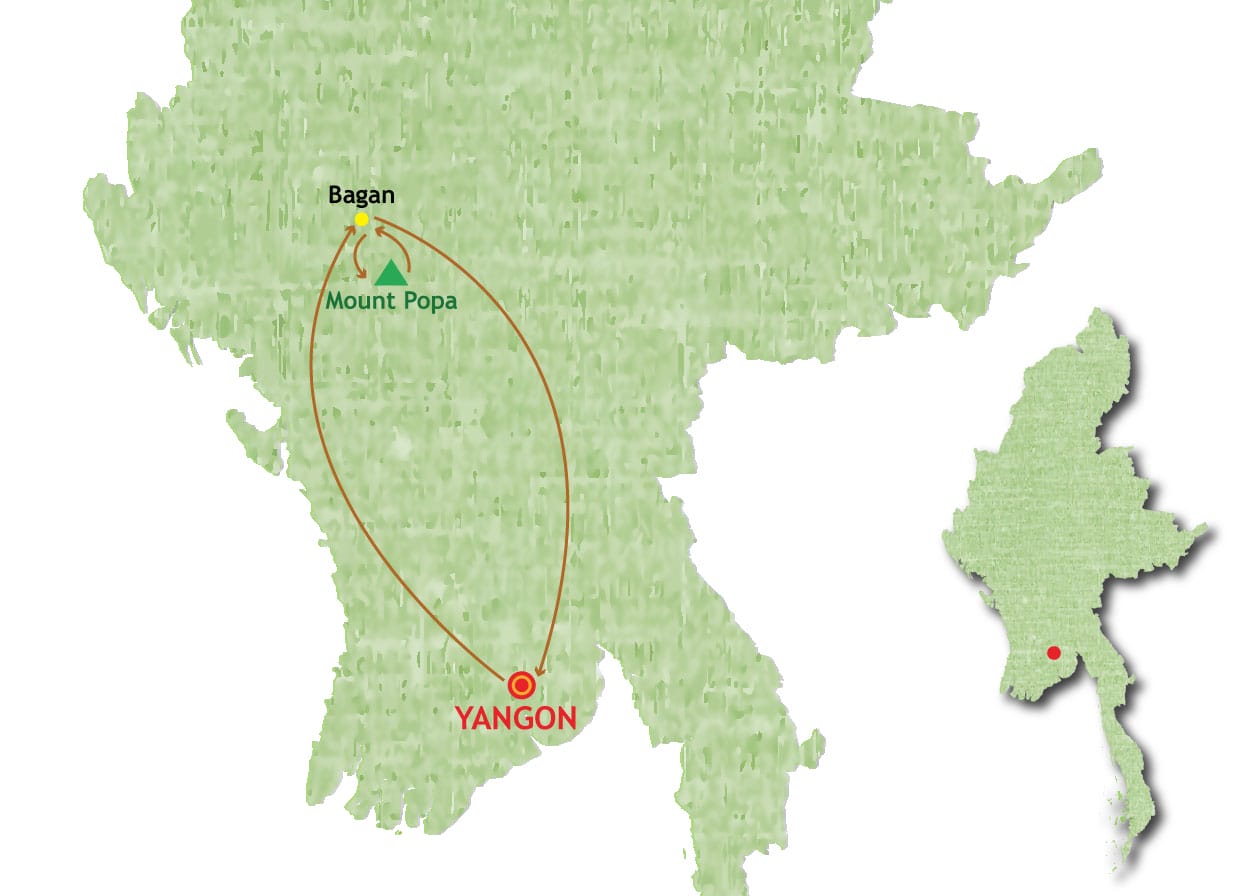 Day 1: Yagon Arrival Day 2: Yangon - Bago -Yangon Day 3: Yangon - Bagan Day 4: Bagan - Mount Popa - Bagan Day 5: Bagan -Yangon Day 6: Yangon Departure |