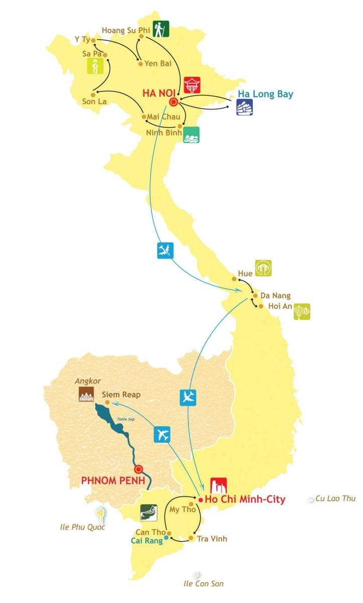 Day 01: Hanoi arrival – city tour – cyclo ride (-/L/-) Day 02: Hanoi – Ninh Binh – Hoa Lu ancient capital - Tam Coc – Jade cave (B/L/-) Day 03: Hoa Lu - Hoa Binh - Mai Chau (B/L/D) Day 04: Mai Chau - Moc Chau - Son La (B/L/-) Day 05: Son La - Quynh Nhai - Than Uyen – Sapa (B/L/-) Day 06: Sapa - Ban Khoang - Ta Giang Phinh - Y Ty – Y Ty Lodge (B/L/-) Day 07: Y Ty - Trekking - Y Ty (B/L/-) Day 08: Y Ty - Muong Hum Market - Yen Bai (B/L/-) Day 09: Yen Bai – Hoang Su Phi – Nam Hong - Hoang Su Phi Lodge (B/L/-) Day 10: Hoang Su Phi Lodge – Trekking – Nam Khoa – Hoang Su Phi Lodge (B/L/-) Day 11: Hoang Su Phi Lodge - Nam Nghi village - Hill tribe - Hanoi (B/L/-) Day 12: Hanoi - Ha Long Bay – Surprise cave - Overnight on cruise (B/L/D) Day 13: Ha Long Bay – Hanoi – Danang – Hoi An (B/L/-) – by flight Day 14: Hoi An – Walking tour – Boat ride – Danang – Hue (B/L/-) Day 15: Hue – Imperial city tour – Boat ride – Saigon (B/L/-) – by flight Day 16: Saigon – city tour – My Tho – Tra Vinh (B/L/-) Day 17: Tra Vinh - Can Tho – City tour (B/L/-) Day 18: Cai Rang floating market – Saigon – Siem Reap (B/L/-) – by flight Day 19: Siem Reap – Angkor Thom – Angkor Wat (B/L/-) Day 20: Siem Reap – Tonle Sap Lake – Departure (B/L/-) |