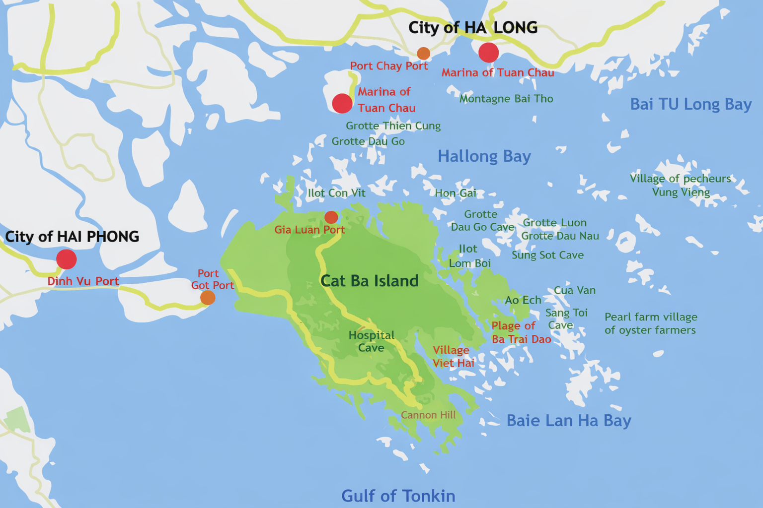 Day 1: Hanoi - Tuan Chau Port - Halong Bay - Lan Ha Bay Day 2: Tai Chi - Quan Y Cave (Cat Ba Military Hospital Cave) - Tuan Chau Island - Hanoi |