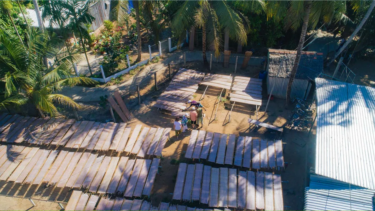11:00, Arrival at the pier of Cai Be. Transfer by junk which takes us to a sumptuous traditional residence, former imperial residence, where the descendants of the family of Kiet welcome you and invite you to taste tea accompanied by savory samples of tropical fruits. We have the opportunity to walk through the orchard. Continuation towards the artisanal villages where rice and coconut products are produced: rice alcohol, puffed rice cakes, rice paper, coconut milk sweets.