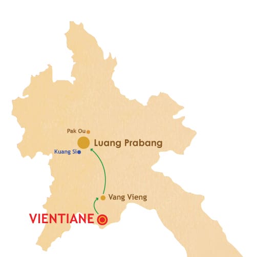 DAY 01: Vientiane - arrival DAY 02: Vientiane - Vang Vieng (B) DAY 03: Vang Vieng - Luang Prabang (B) DAY 04: Luang Prabang - Pak Ou Caves (B) DAY 05: Luang Prabang - Kuang Si Waterfalls (B) DAY 06: Luang Prabang - Departure (B)