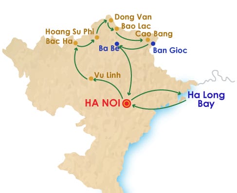 Day 01 : Hanoi arrival Day 02 : Hanoi – Discover (B.L.D) Day 03 : Hanoi – Vu Linh (B.L.D) Day 04 : Vu Linh – Bac Ha Market (B.L.D) Day 05 : Bac Ha Market – Hoang Su Phi (B.L.D) Day 06 : Hoang Su Phi – Dong Van (B.L.D) Day 07 : Dong Van – Bao Lac (B.L.D) Day 08 : Bao Lac – Cao Bang (B.L.D) Day 09 : Cao Bang – Ban Gioc Waterfall (B.L.D) Day 10 : Quang Hoa – Ba Be Lake (B.L.D) Day 11 : Ba Be Lake – Hanoi (B.L.D) Day 12 : Hanoi – Halong Cruise (B.L.D) Day 13 : Halong Cruise – Hanoi (B.L) Day 14 : Hanoi – Departure (B) |