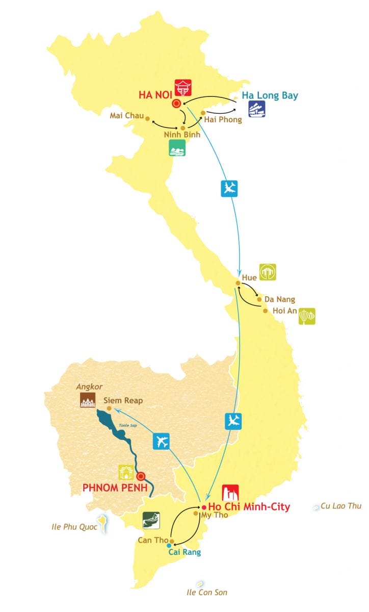 Day 1: Hanoi arrival – Free Day 2: Hanoi – City tour Day 3 : Hanoi – Hoa Binh – Mai Chau Day 4 : Mai Chau – Ninh Binh Day 5: Ninh Binh – Halong bay - Overnight on boat Day 6 : Halong – Hai Phong – Hue by flight Day 7 : Hue city tour Day 8: Hue – Danang – Hoian Day 9: Hoian – Danang – Saigon by flight – Ben Tre - Can Tho Day 10: Can Tho - Floating market Cai Rang – Saigon - Siem Reap by flight Day 12: Siem Reap : Angkor - Tonlé Sap Day 13: Siem Reap: Ta Prohm, Chay Say Day 14: Siem Reap – Departure |