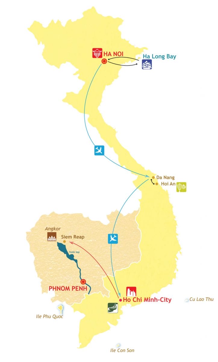 Day 1: Arrival in Hanoi (D) Day 2: Hanoi City Tour (B,L) Day 3: Hanoi – Halong Bay (B,L,D) Day 4: Halong Bay – Hanoi – Danang – Hoi An (B,L) Day 5: Hoi An Sightseeing (B,L) Day 6: Hoi An – Ho Chi Minh City (B,L) Day 7: Ho Chi Minh City – Mekong Delta (B,L) Day 8: Ho Chi Minh City – Siem Reap (B,D) Day 9: Siem Reap Explore (B) Day 10: Siem Reap – Departure (B) |