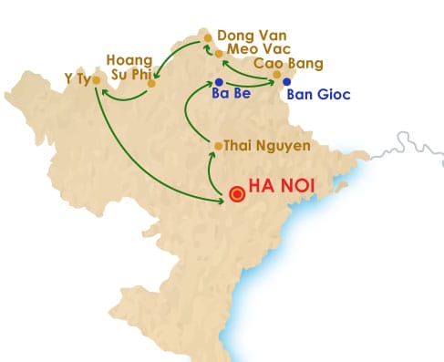 Day 1: Hanoi - Thai Nguyen - Ba Be - Walking tour Day 2: Private Boat Rides on Ba Be Lake - Cao Bang Day 3: Cao Bang - Ban Gioc Waterfall - Nguom Ngao Cave - Cao Bang Day 4: Cao Bang - Bao Lac - The Unknown Land Day 5: Bao Lake - Meo Vac - Dong Van Day 6: Dong Van - Yen Minh - Quan Ba - Hoang Su Phi Day 7: Thong Nguyen Typical Market - Hiking - Quang Binh Day 08: Quang Binh - Sapa Day 09: Sapa—Typical Coc Ly Market—Hanoi |