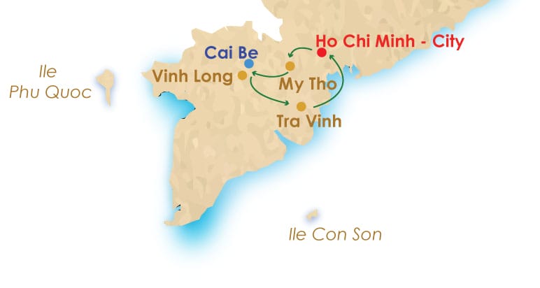 Day 01: Saigon Arrival – Discovery (L, D) Day 02: Saigon – My Tho (B, L, D) Day 03: My Tho – Cai Be – Vinh Long (B, L, D) Day 04: Vinh Long Discovery (B, L) Day 05: Vinh Long – Tra Vinh – Saigon (B, L) Day 06: Saigon – Cu Chi – Saigon (B, L) Day 07: Saigon – Departure (B)